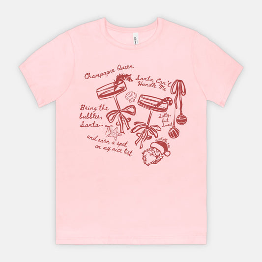 Champagne Queen Seashell Pink Tee – Coastal Santa Graphic Tee for Winter Comfort