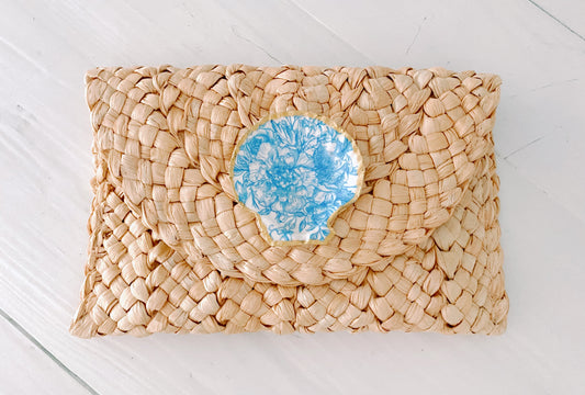 Gilded Blue and White Floral Florida Seashell Straw Clutch