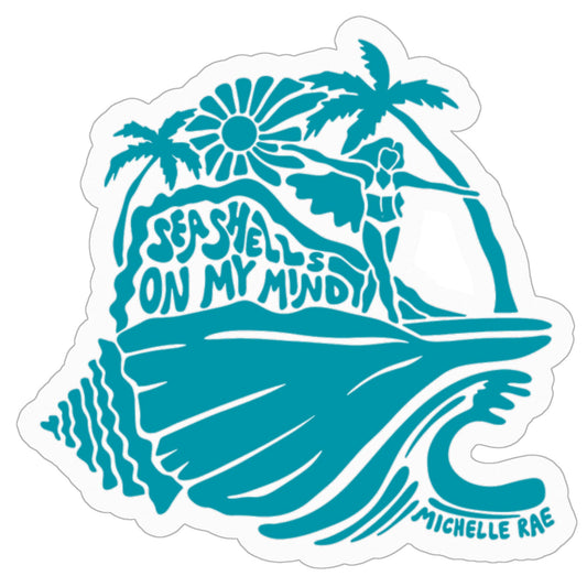 Seashells On My Mind Sticker – 3" x 3" vinyl coastal decal. Waterproof, durable, and perfect for laptops, water bottles, and ocean-inspired gifts.
