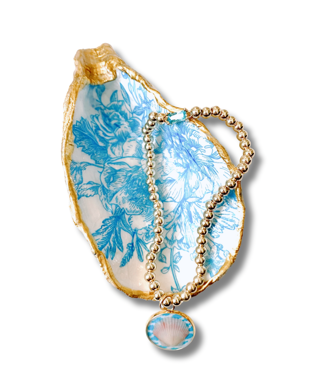 Beach Inspired Gift Set – Blue Toile Oyster Jewelry Dish & 14k Gold Plated Beaded Seashell Charm Bracelet with Rhinestone