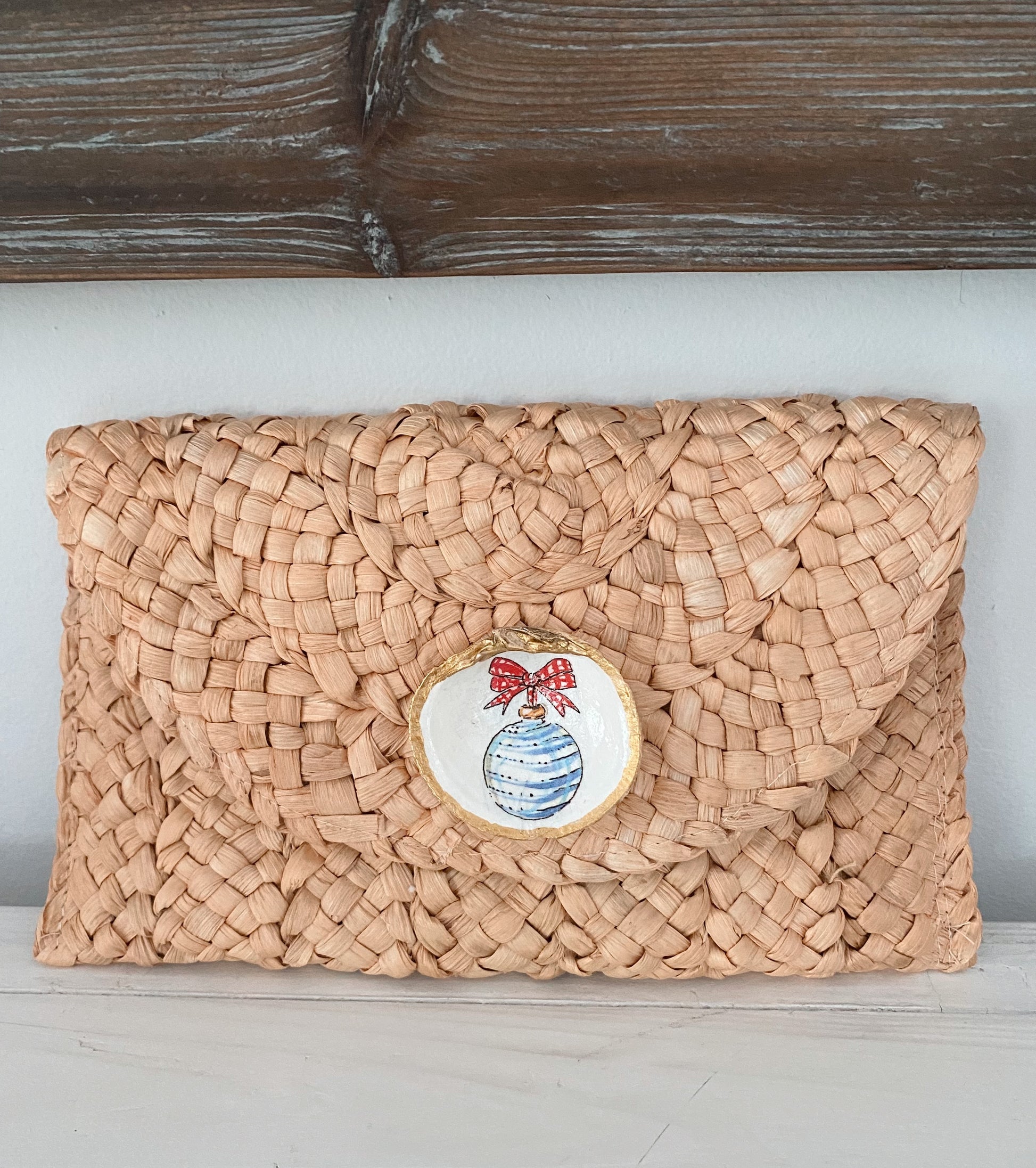This beige woven straw clutch is adorned with a Florida seashell, hand-gilded and decoupaged with a festive blue Christmas ornament tied with a red bow. The golden edges add a touch of holiday shimmer while the natural woven texture keeps it perfectly coastal.
