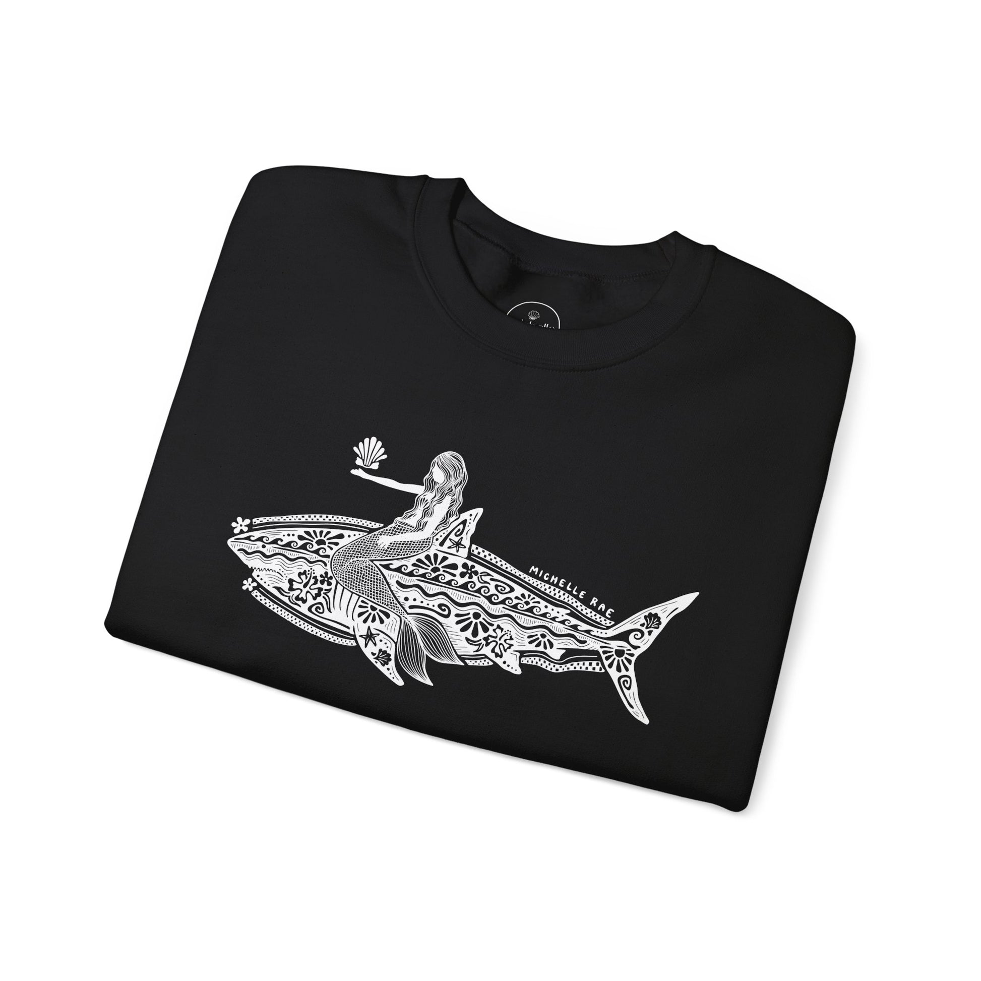 Mermaid Shark Black Crewneck Sweatshirt – Coastal Graphic Pullover for Women